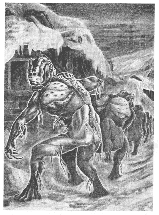Он показывает на морду — по-другому это не назовешь — этого существа. Его черты напоминают летучую мышь: плоский нос с широкими ноздрями, пустые, слепые глаза, на которые страшно смотреть.