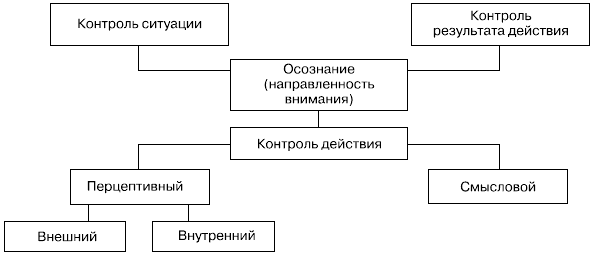 Рассмотрим схему на рис. 5.4. В ней нашли отражение все четыре точки зрения на осознанный контроль за автоматизированным действием. Концентрированное внимание человека, выполняющего достаточно хорошо усвоенное действие, может быть направлено на контроль за ситуацией, на результат действия, на само действие. Причем контроль за действием бывает двух видов: смысловой (что и как делать) и перцептивный (что происходит с частями тела, каково напряжение мышц и т. д.). В свою очередь, перцептивный контроль можно разделить на внешний – зрительный, слуховой, тактильный и внутренний – проприорецептивный и вестибулярный.