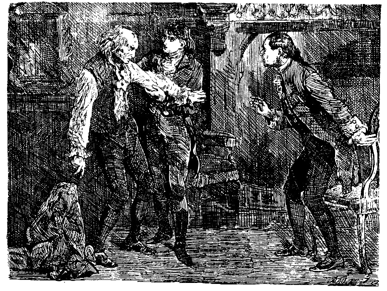 В зале не было никого посетителей, кроме Жака Третьего, Картон видел его на скамье присяжных и запомнил по его каркающему голосу и беспрестанно шевелящимся пальцам. Он стоял у стойки с рюмкой в руке и разговаривал с супругами Дефарж. В разговоре участвовала и Месть, по-видимому свой человек в этом заведении.