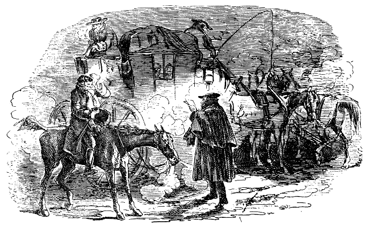 Пассажир, который занимает немалое место в нашем повествовании, уже ступил на подножку и нагнулся, чтобы войти в карету, а двое других стояли рядом внизу, готовясь последовать за ним. Он так и остался стоять на подножке, втиснувшись одним боком в карету, а те двое стояли, не двигаясь, внизу. Все они переводили глаза с кучера на кондуктора, с кондуктора на кучера и прислушивались. Кучер, обернувшись, смотрел назад; и кондуктор глядел назад, и даже красноречивая коренная, повернув голову и насторожив уши, смотрела назад, не вступая ни в какие пререкания.