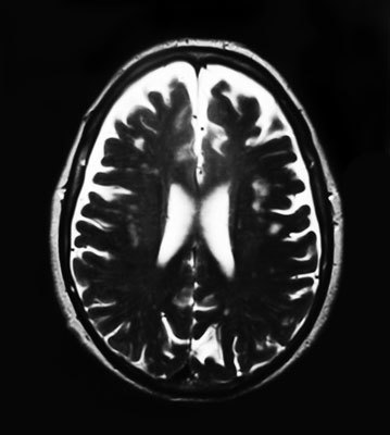 МРТ-снимок мозга девушки, которая жалуется на периодические головокружения. Кроме того, она не может сразу подобрать нужные слова. В правой лобной доле (если смотреть на фото так, как есть, – то слева) видна лимфатическая мальформация.