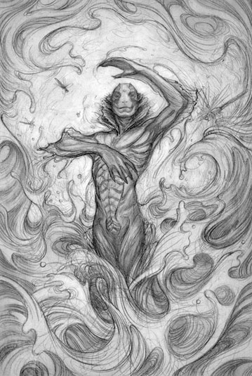Deus Brânquia наконец поднимается на мелководье, кровавое солнце освещает череду древних гор за его спиной, древний глаз затмения восходит над землей, океан снимает с себя скальп, чтобы показать новый мир, ненасытный ледник, блевотину из морской воды, укус бактерии, кипение одноклеточной жизни, разделение видов, реки как сосуды, ведущие к сердцу, эрекцию горных пиков, качающиеся бедра подсолнуха, серую шерсть омертвения, нагноение на розовой плоти, пуповину, тянущуюся от нас к истоку нашего рода.