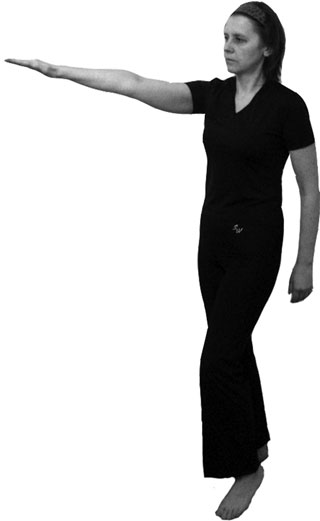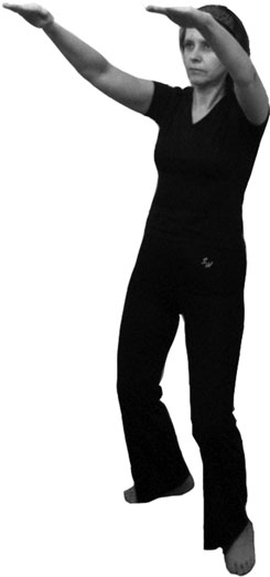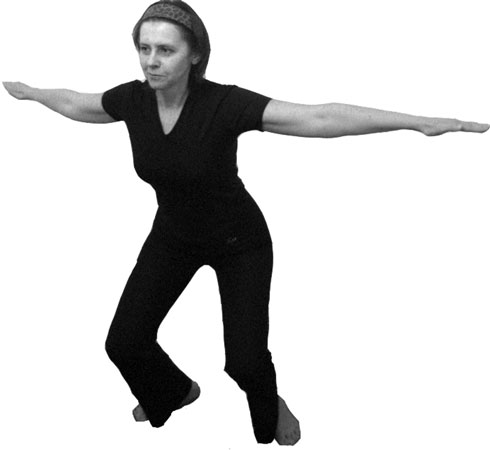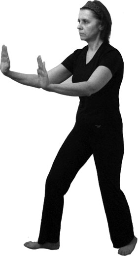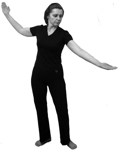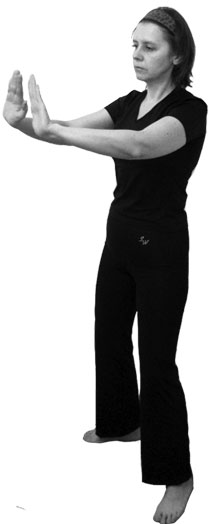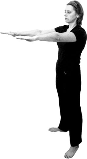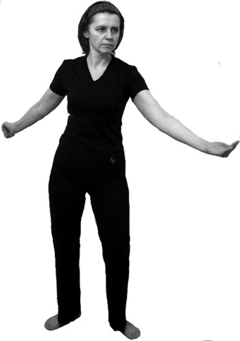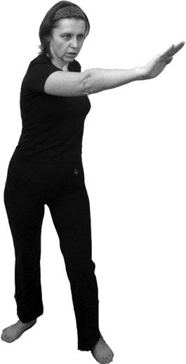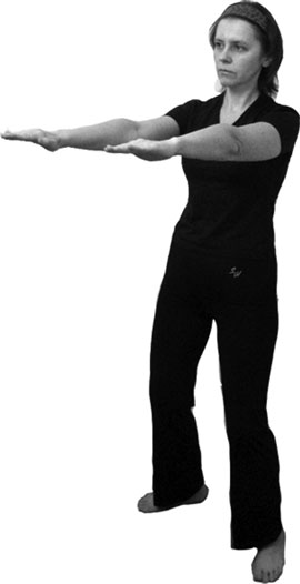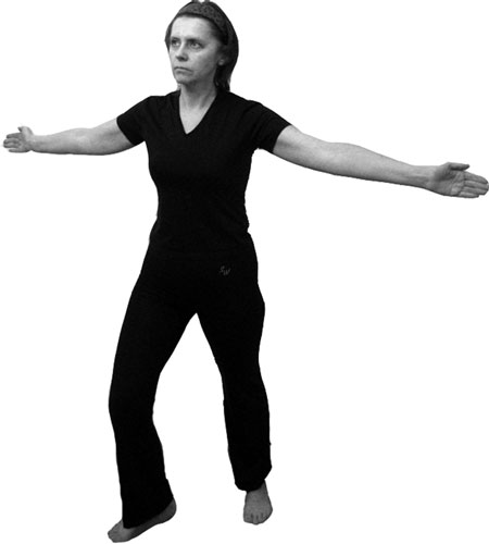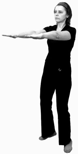 Исходное положение: Стоя в полуприседе (поза всадника), ноги на ширине плеч. Спина прямая. Грудь немного втянуть. Руки развернуты в стороны и выпрямлены, ладони обращены вниз. Взгляд направить прямо перед собой (фото 120).