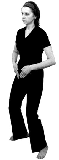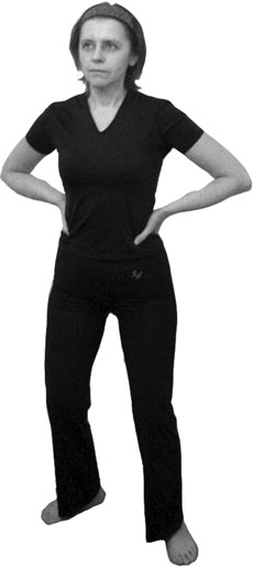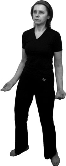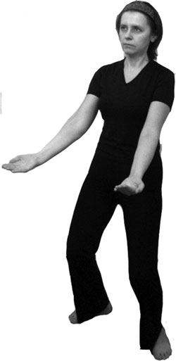 Исходное положение: Стоя в полуприседе (поза всадника), ноги на ширине плеч. Спина прямая. Грудь немного втянуть. Руки на уровне поясницы, ладони обращены вверх. Взгляд направить прямо перед собой (фото 118).