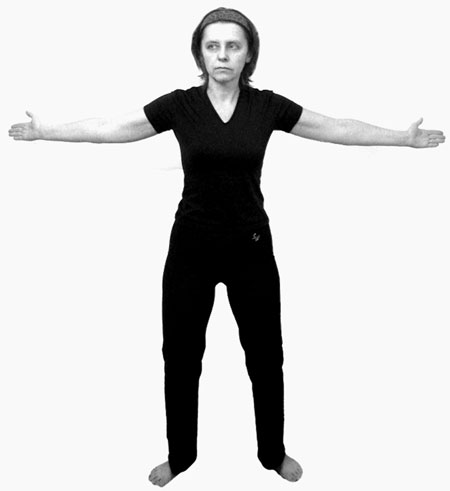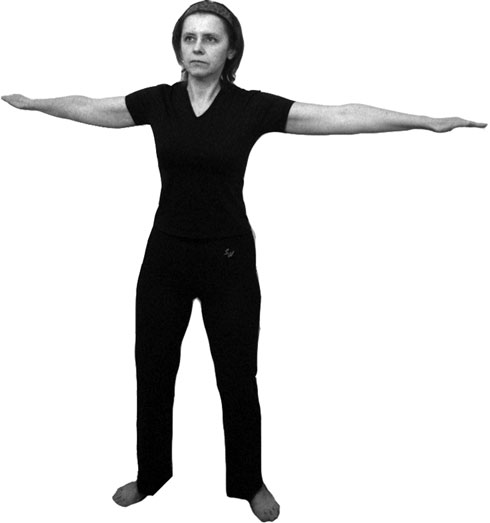 2. Встаем, не меняя положения раскинутых рук – они поднимаются вместе с телом. Одновременно делается выдох.