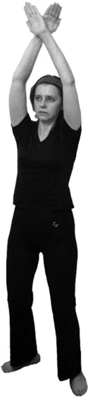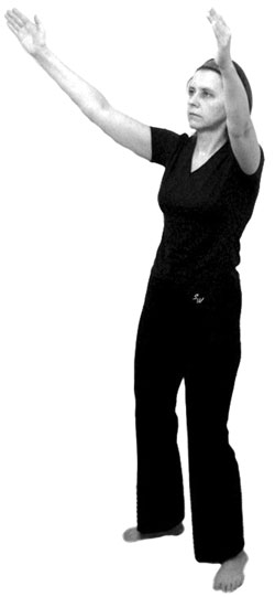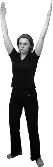 1. Руки постепенно поднимаем до уровня груди, потом до макушки (фото 98), потом тянем вверх, раскрываем ладони. Колени одновременно полностью распрямляются. Во время этого движения делается вдох и не прерывается, а длится и на следующем движении.