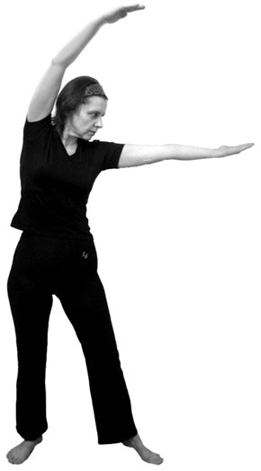 3. Центр тяжести тела переносим на левую ногу, немного сгибаем ее в колене. Правую ногу вытягиваем носком вперед (носок упирается в пол, пятка оторвана от земли). Делаем наклон вправо – правая рука прямая. Левая рука при наклоне описывает над головой полукруг. Во время этого движения делается выдох.