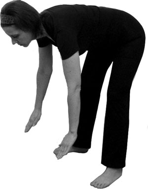 Исходное положение: Стоя, ноги на ширине плеч. Спина прямая. Грудь немного втянуть. Руки опустить вдоль туловища. Взгляд направить прямо перед собой. Колени немного присогнуты (как в предыдущем упражнении).