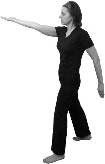 2. Делаем шаг правой ногой вперед, помогая всем корпусом, выполняем толчок руками вперед и вверх (одновременно делаем выдох). Центр тяжести тела переносится на правую ногу, пятка хорошо упирается в пол, носок задран. Замираем на секунду в этом положении – руки держим на уровне груди (фото 115). Заканчивая выдох, опираемся на полную правую стопу.