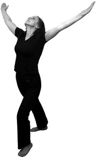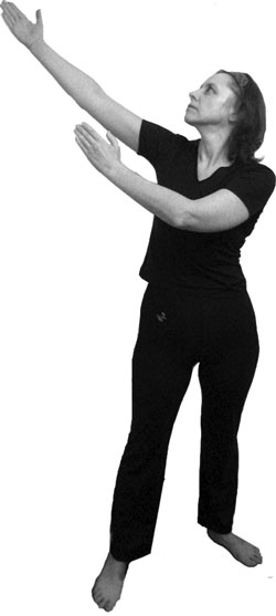 3. Обе прямые руки одновременно делают махи назад, а потом вперед направо и вверх. Верхняя часть туловища тоже движется вправо. Голову задираем, смотрим на луну, взошедшую справа. Одновременно делаем вдох.