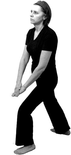Исходное положение: Стоя в полуприседе (поза всадника), ноги на ширине плеч. Спина прямая. Грудь немного втянуть. Руки находятся на уровне нижней части живота. Взгляд направить прямо перед собой.