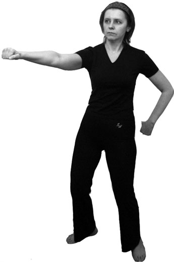 1. Выбрасываем прямую правую руку вперед, при этом обращаем ладонь вниз и сжимаем руку в кулак. Левая рука резко отводится назад (фото 119). Во время выброса делаем вдох.