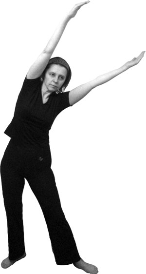 2. Центр тяжести тела переносим на правую ногу, немного сгибаем ее в колене. А левую ногу вытягиваем носком вперед (носок упирается в пол, пятка оторвана от земли). Делаем наклон влево – левая рука прямая и постепенно оказывается в горизонтальном положении. Правая рука во время наклона описывает над головой полукруг. Вдох продолжается и во время этого движения (фото 99).