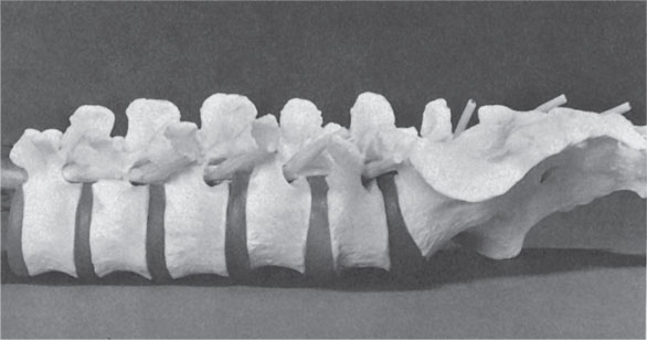 Рис. 13б. Анатомическая модель показывает, что даже очень слабый прогиб спины эффективно раскрывает межпозвонковые пространства спереди