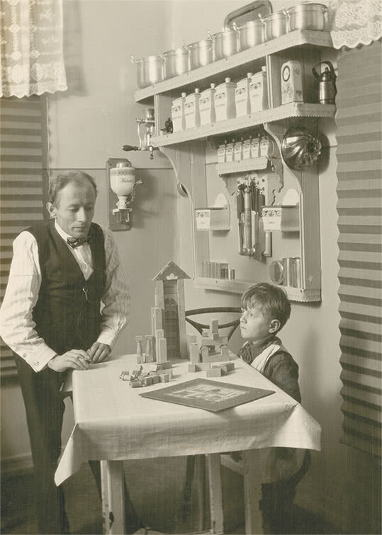 За дверью оказалась маленькая, чисто прибранная кухня. За столом сидел мальчик, а над ним стоял мужчина в галстуке-бабочке. На столе лежал пазл и высилась башенка, собранная из детского конструктора, но выглядело это все не как игра: мальчик будто сдавал какой-то экзамен. Услышав наши шаги, мужчина поднял руку и указал на следующую дверь: