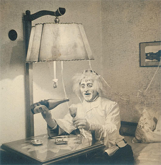 Я бы бросился бежать без оглядки, если бы только мог, – да вот только ноги по-прежнему еле слушались. Пел человек в клоунском гриме и белом, как кость, парике. Он сидел на тахте за коктейльным столиком и наливал себе что-то из бутылки. Снова и снова он повторял одну и ту же последовательность действий, словно его заело: отпивал глоток из стакана в руке, доливал в стакан из бутылки и, промычав слова из песенки, делал еще глоток. Увидев нас, он поднял стакан и произнес:
