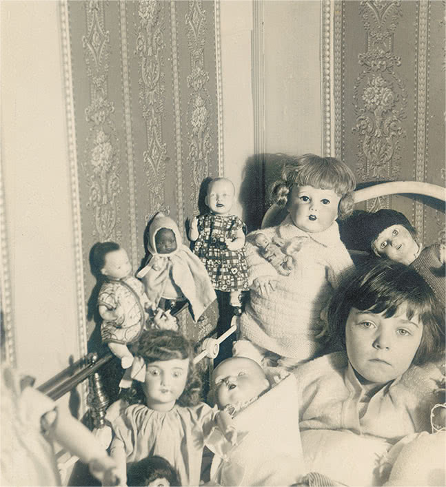 И мы пошли, все вместе, и очутились в спальне, битком набитой куклами. Куклы валялись на полу и на полках, которыми были увешаны стены, громоздились на кресле, стоявшем в углу, и на кровати с железной спинкой. Их было так много, что поначалу я не увидел среди них девочку. Та сидела на кровати, наполовину погребенная под лавиной маленьких фарфоровых лиц, и я заметил ее лишь тогда, когда она заговорила вновь.