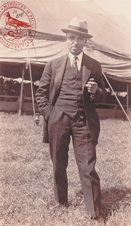 Кабинет оказался большой и роскошный: повсюду позолота и дерево с тонкой резьбой. У дальней стены, закинув ноги на огромный полированный стол, сидел ожидавший нас человек. Он был в костюме в тонкую полоску с вульгарным фиолетовым галстуком и в фетровой шляпе кремового цвета, плохо сочетавшейся со всем остальным. Рядом стоял еще один человек – весь в черном, как гробовщик.