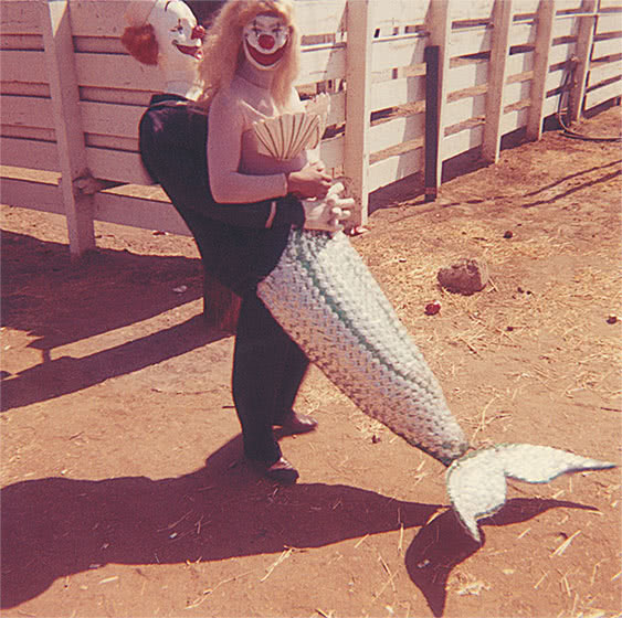 За шатрами мы увидели двух субъектов в клоунском гриме. Один – вернее, одна – с копной белых кудряшек, щеголяла в костюме русалки. Другой неуклюже тащил ее куда-то, пятясь вперед спиной и подхватив свою ношу под мышки, так как ноги русалки были внутри костюма и пользоваться ими она не могла.