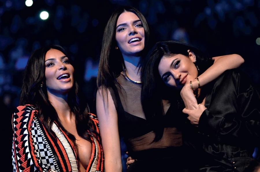 Ну надо же, как вы выросли! Кендалл и Кайли возвышаются над Ким, когда они вместе смотрят церемонию вручения наград MTV в инглвудском «Форуме», август 2014 года.