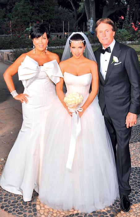 Свадьба Ким и Криса в Монтесито, Калифорния, была ослепительным событием. Гости могли быть одеты либо в белое, либо в черное. Ее мать выбрала белое, а отчим предпочел элегантный черный смокинг.