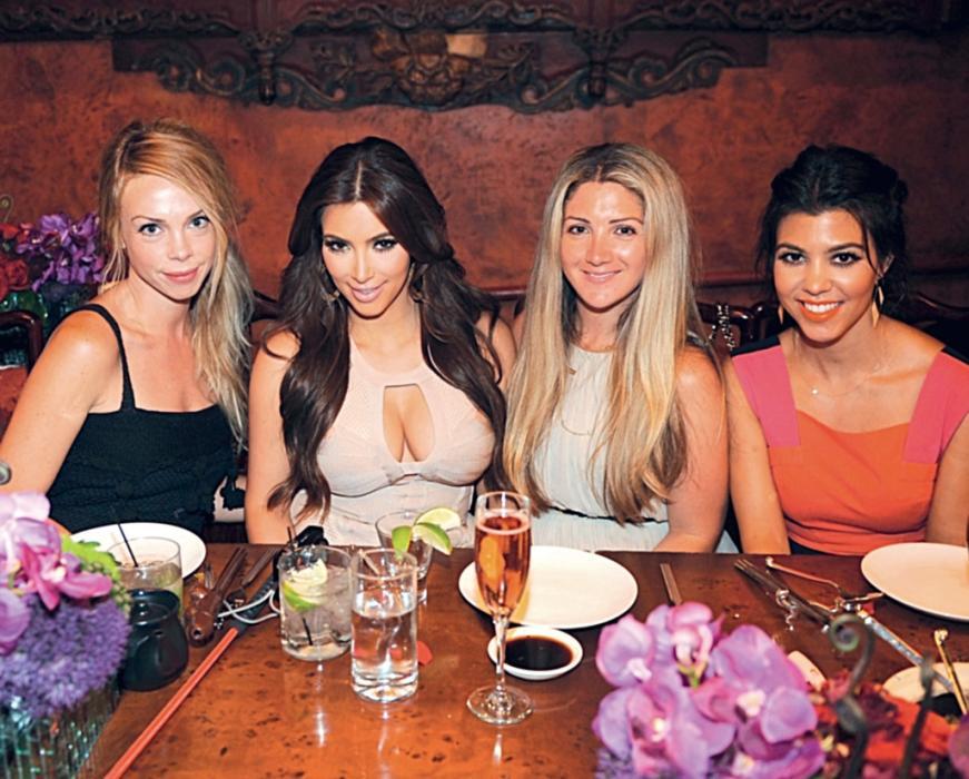 Элисон Азофф (справа от Ким), которая всю жизнь была близкой подругой Ким, нечасто фотографируется и игнорирует мир знаменитостей. Она совершила такой редкий для нее выход в свет, чтобы поддержать Ким на ужине-девичнике в клубе TA O в Лас-Вегасе.