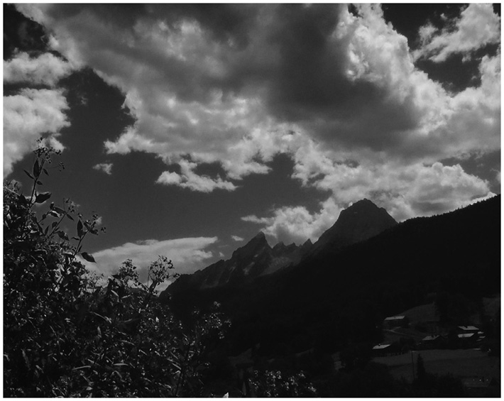 Чисто-белые, словно подушки, облака, плывут по темно-синему небу над силуэтами альпийских горных хребтов. Подобную величественную картину можно наблюдать во многих уголках земного шара. Обе фотографии похожи за исключением одного момента. Верхнее фото основывается на двух доминантных диагональных линиях, лежащих в противоположных направлениях. Они как будто бы хотят выйти за пределы изображения. Композиция этой фотографии довольно проста.