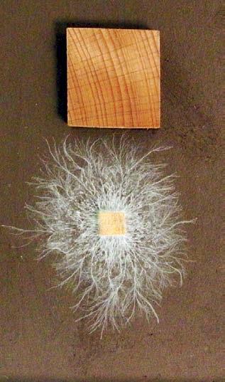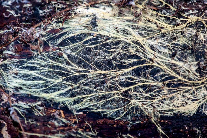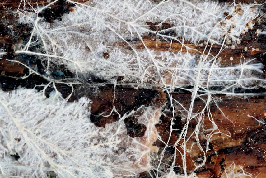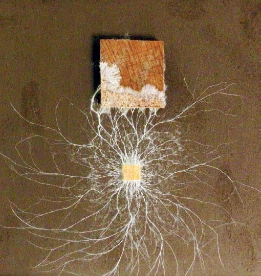 Мицелий домового гриба, изучающий и поглощающий полено. Фото Alison Pouliot