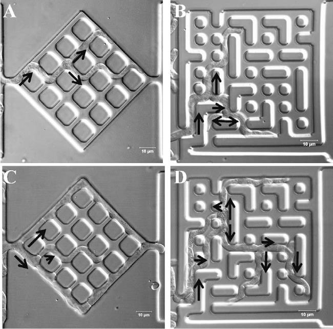 Хлебный плесневый грибок нейроспора густая, Neurospora crassa, проходящий микроскопический лабиринт. Черными стрелками помечено направление роста в местах ветвления и на входе.