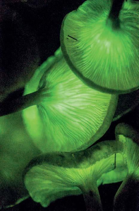 Биолюминисцентный мицелий сычужного гриба, Panellus stipticus, растущего на обломках дерева. На первой подводной лодке Turtle, сконструированной во время Войны за независимость США, применялись подобные грибы для подсветки глубиномера. Английские шахтеры в XIX веке сообщали о грибах на опорах, которые отбрасывали достаточно света, чтобы различать в темноте руки. Фото Patrick Hickey
