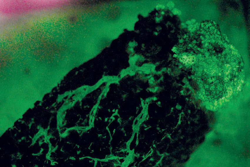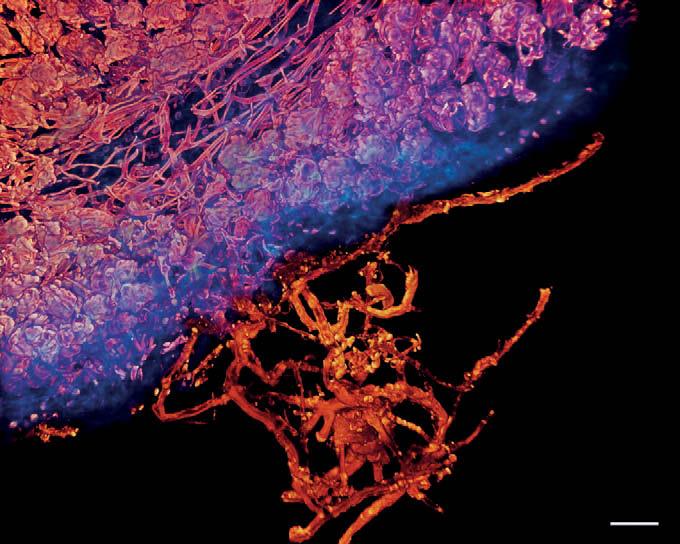 Микоризные грибы врастают в корень растения. Гриб показан красным, граница корня растения – синим. Внутри корня грибы обильно разрослись. Масштаб: 50 мкм. Изображение автора