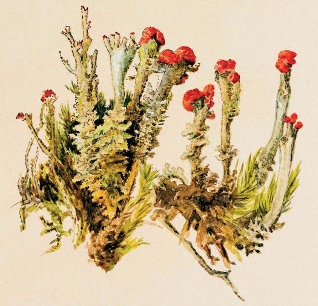 Лишайник кладония, Cladonia. Иллюстрация Беатрис Поттер