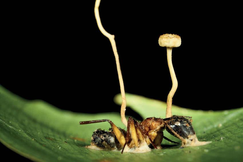 Муравей-древоточец, пораженный кордицепсом Ллойда, Ophiocordyceps lloydii. Два плодовых тела гриба показались из тела насекомого в Бразильской Амазонии. Фото Joгo Araъjo