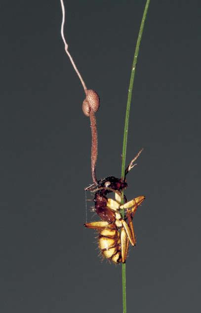 Муравей-древоточец, пораженный грибом Ophiocordyceps camponotiatricipis. Плодовое тело гриба «выстрелило» из головы насекомого. Образец найден в Бразильской Амазонии.