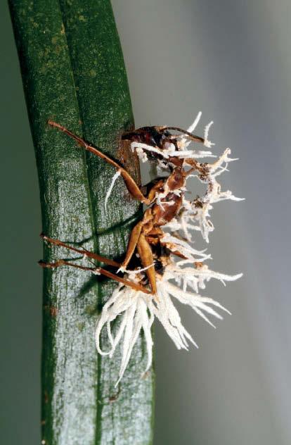 Муравей-древоточец, пораженный грибом Ophiocordyceps camponotinidulantis. Гриб – белесый пушистый налет, а плодовое тело возникает из задней части головы насекомого. Образец найден в Бразильской Амазонии. Фото Joгo Araъjo