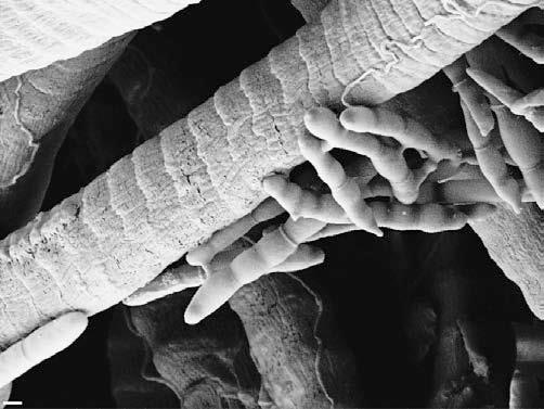 Кордипепс, оплетающий мышечные волокна муравья. Маcштаб: 2 мкм.