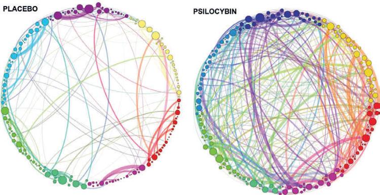 Сети показаны в виде разноцветных точек по окружности. После введения псилоцибина возникает шквал новых нейронных связей. Способность псилоцибина изменять сознание человека, судя по всему, связана с этими потоками в мозге. Изображение воспроизводится по Petri, et al (2014) Плацебо Псилоцибин