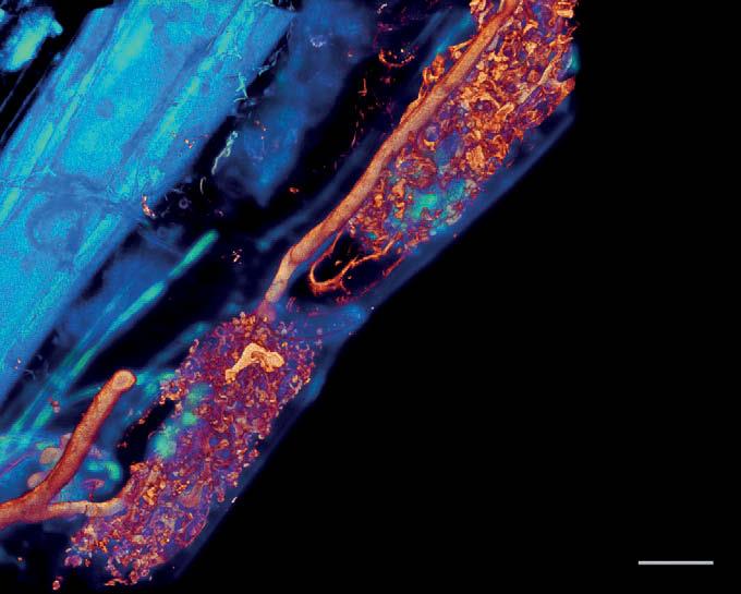 Микоризные грибы внутри корней растений. Гриб показан в оттенках красного, растение – синего. Тонкие разветвленные структуры внутри клеток растений известны как арбускулы (в дословном переводе – «деревца»); там и происходит обмен между растением и грибом. Масштаб: 20 мкм. Изображение автора