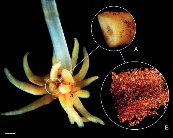 Неподражаемая близость. Корни микогетеротрофа Voyria tenella населяют огромные колонии микоризных грибов. В области А грибы выглядят как светлое кольцо у края корня. В области B грибы показаны красным, а ткани растения не показаны. Масштаб: 1 мм. Изображение воспроизводится по Sheldrake, et al. (2017)