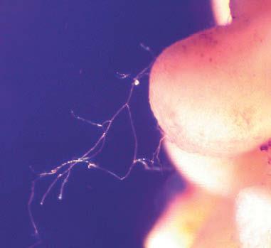Корни микогетеротрофа Voyria tenella плохо приспособлены к поглощению воды и питательных веществ из почвы и превратились в своеобразные «грибные фермы». Обратите внимание на гифы микоризных грибов, опускающиеся с корней. Частицы почвы задерживаются липкой паутиной мицелия. Это редкий кадр, запечатлевший грибные связи, соединяющие растения с миром. Фото автора