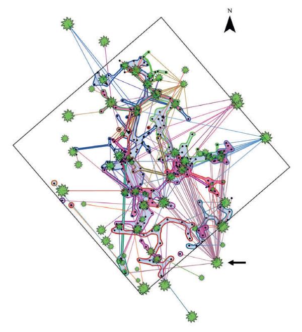 Карта общей грибной сети Кевина Бейлера (Kevin Beiler). Зеленым показаны Дугласовы пихты, а прямые линии показывают связи между микоризными грибами и корнями деревьев. Черные точки – места, где Бейлер брал образцы. Генетически идентичные грибные сети показаны разными цветами. Сети, образованные микоризным грибом Rhizopogon vesiculosus, помечены синим, а грибом Rhizopogon vinicolor – розовым. Черная граница – участок 30 Ч 30 метров; стрелка указывает на дерево с наибольшим числом связей (имеющее отношение к 47 другим деревьям). Изображение воспроизводится по Beiler, et al. (2009)