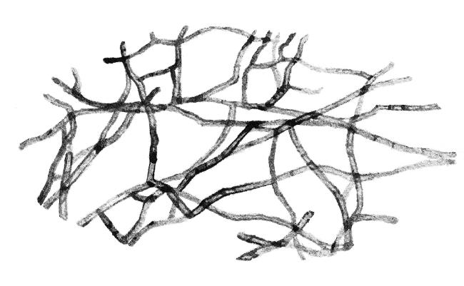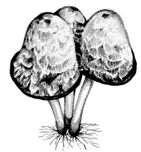 Гифы составляют мицелий, но из них состоят и более плотные структуры. Плодовые тела грибов возникают из спрессованных гифовых нитей. Плодовые тела в свою очередь способны и на другие подвиги, помимо разбрасывания спор. Некоторые, такие как трюфели, испускают дивные ароматы, что превратило их в одни из самых дорогих пищевых продуктов в мире. Другие, такие как навозник белый (Coprinus comatus; копринус хохлатый), способны пробиться сквозь асфальт и приподнять тяжелые тротуарные плиты, хотя сами не отличаются жесткостью. Срезанный навозник белый можно поджарить и съесть. Если же вы оставите его в банке, его ослепительно-белая мякоть за несколько дней растворится, превратившись в черные как смоль чернила (иллюстрации к этой книге нарисованы чернилами из навозника белого).