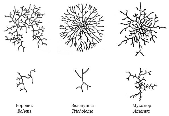 Мицелий помещает себя в окружающую среду, но все же число вариантов его развития небесконечно. Разные виды грибов образуют разные виды грибниц. У некоторых видов гифы тонкие, у других – толстые. Некоторые привередливы, другие не очень. Некоторые из них вырастают в эфемерные пушинки, не выходящие за пределы источников пищи, и могут поместиться на крохотной частичке пыли. Другие виды образуют грибницы-долгожители, покрывающие километры пространства. Некоторые тропические виды вообще не едят соседей, а ведут себя как фильтраторы – отращивают сети из толстых прядей мицелия и используют их для ловли падающих листьев.