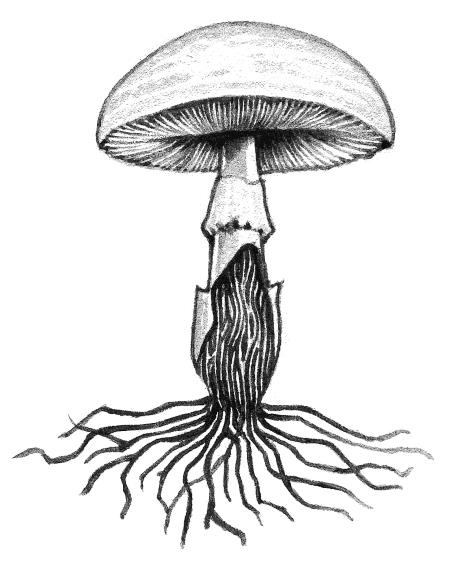 Когда вы смотрите на грибы, вы смотрите на плоды. Представьте себе, что на месте грибов из-под земли растут виноградные гроздья. А теперь вообразите себе виноградную лозу, которая породила их, извивающуюся и ветвящуюся под землей. Ягоды и лоза составлены из разных видов клеток. Срежьте гриб, и вы убедитесь, что он составлен из того же типа клеток, что и мицелий: из клеток гиф.