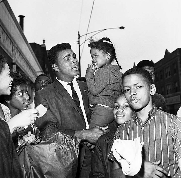 Али обожал публику, и его часто поджидали толпы поклонников на 79-й улице в Чикаго рядом с офисами «Слова Мухаммада» и популярным клубом Tiger Lounge. © Lowell K. Riley