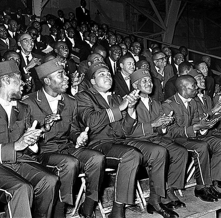 Али аплодирует на собрании «Нации ислама», одетый в форму «Плодов ислама», военизированного крыла внутри организации исключительно для мужчин. © Lowell K. Riley