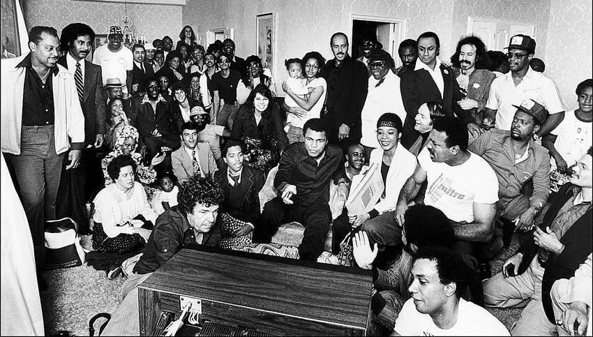 Джин Килрой (слева спереди) настраивает телевизор в гостиничном номере чемпиона, чтобы Али вместе с друзьями могли посмотреть один из его боев. © Michael Gaffney Photo