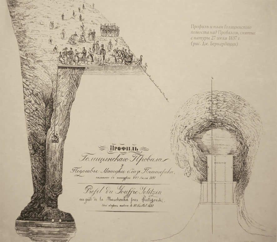 В 1837 году по идее и на средства того же богатого князя В. С. Голицына, которого знал Лермонтов, упомянутый Джузеппе Бернардацци и его брат соорудили над Провалом деревянный помост. С него при помощи блоков на канате опускалась и поднималась кабина с прикрепленным креслом для желающих осмотреть изнутри пропасть глубиной 27 метров. Князь просил местные власти разрешить братьям Бернардацци брать плату с желающих осмотреть Провал или спуститься в него. За вход на помост следовало брать плату по 25 копеек с человека, а за спуск – по 1 рублю. Идея «великого комбинатора» Остапа Бендера по продаже билетов в Провал оказалась не нова. Однако начальство не одобрило ходатайство князя Голицына, выразив сомнения в безопасности, и впоследствии помост над Провалом по приказу пятигорского коменданта В. И. Ильяшенкова был снят.