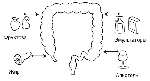 Жир. Повышает проницаемость кишечника и меняет состав микрофлоры. На животных моделях было показано, что жир из молока увеличивает секрецию таурохолевой кислоты в желчи, которая служит субстратом для роста бактерии Bilophila wadsworthia. Эти микробы продуцируют сероводород, нарушающий барьерную функцию. Другим механизмами являются избыточная секреция желчных кислот под влиянием жиров – они оказывают токсическое действие на эпителиальные клетки кишечника за счет детергентных свойств. В экспериментах установлено, что пища с высоким содержанием жиров и желчных кислот вызывает воспаление кишечника и изменяет состав кишечной микробиоты.