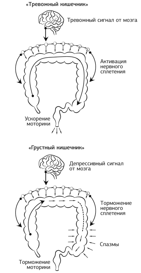 В условиях постоянной тревоги моторика кишечника может вести себя по-разному: замедляться, ускоряться и становиться хаотичной. Чувствительность может повышаться, снижаться или пропадать. Предсказать конкретный вид нарушения не всегда возможно. Чаще тревожность ускоряет моторику и повышает чувствительность, вызывая боль в животе и понос. Но бывает и наоборот: кишечник перестает двигаться, начинает болеть и возникают трудности с его опорожнением. Поэтому неврогенная возбудимость и синдром раздраженного кишечника бывают не только с диареей, но и с запором. В любом случае одной из важных причин являются эмоции, поэтому проблема чаще встречается у молодых людей, психика которых менее стабильная.